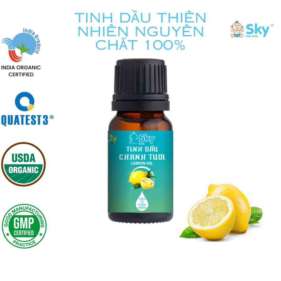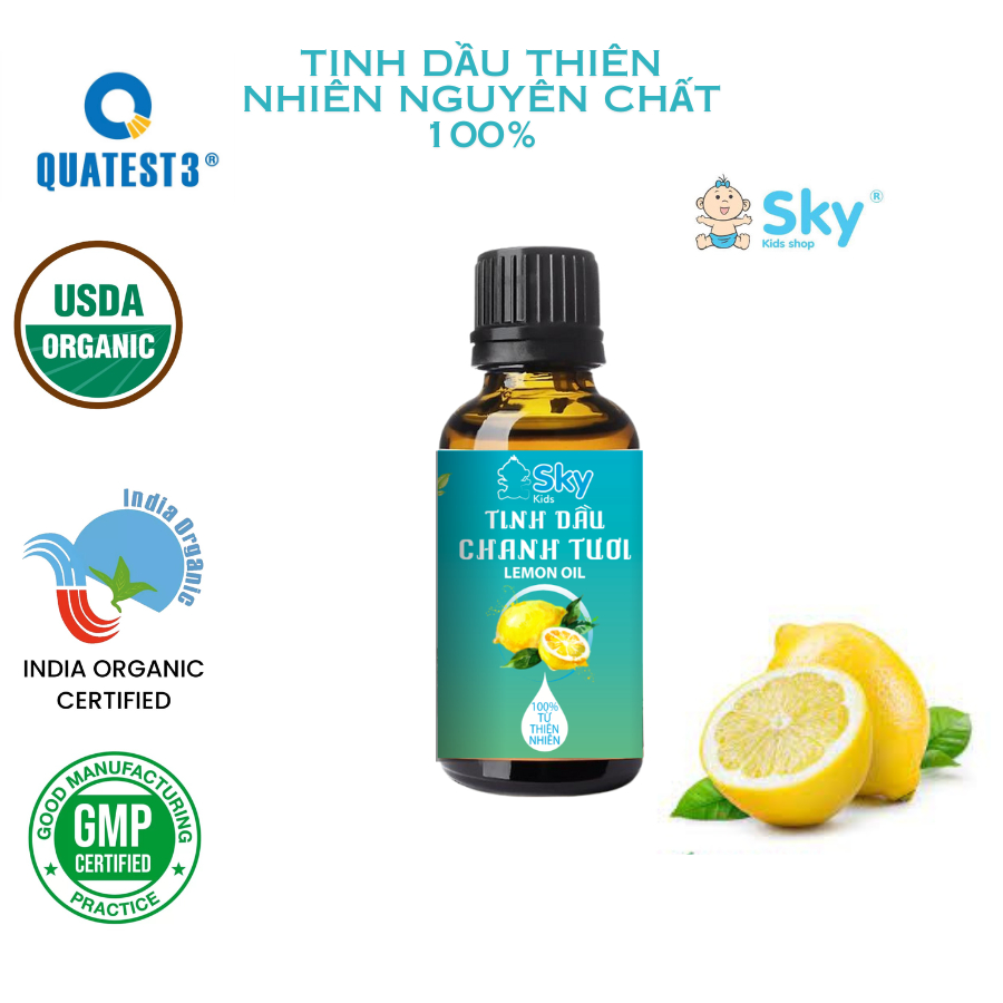 Tên sản phẩm: Tinh dầu Chanh tươi️ Tên tiếng anh: Lemon Essential Oil️ Xuất xứ: Ấn Độ️ Thành phần: 100% chiết xuất từ vỏ chanh️ Phương pháp chiết xuất: Ép lạnh️ Các chứng nhận đạt được: QUATEST 3, USDA – ORGANIC, GMP, ISO 9001-2000CÔNG DỤNG TINH DẦU THƠM PHÒNG CHANH TƯƠI️ Giảm căng thẳng, nâng cao cảm xúc️ Kháng khuẩn, chống nấm️ Khử mùi, thanh lọc không khí️ Giảm buồn nôn️ Giảm mồ hôi và mùi cơ thểChăm sóc da mặtGỢI Ý CÁCH SỬ DỤNG TINH DẦU THƠM PHÒNG CHANH TƯƠI️ Xông phòng giúp thư giãn, khử mùi: cho 6-8 giọt tinh dầu chanh Sky Kids vào máy khuếch tán/máy xông tinh dầu. Hương thơm tươi mát của chanh lan tỏa khắp không gian phòng, khử mùi, thanh lọc không khí.️ Xông hơi giải cảm: Cho 3-5 giọt tinh dầu chanh tươi vào chậu nước ấm, lấy khăn lớn trùm kín đầu và bắt đầu xông, thời gian khoảng 5-10 phút giúp cơ thể thư thái, dễ chịu️ Tắm thư giãn: Nhỏ từ 5-10 giọt tinh dầu chanh vào bồn nước ấm và ngâm mình khoảng 15-20 phút giúp thư giãn, làm sạch da.️ Massage thư giãn: pha loãng tinh dầu chanh cùng dầu nền (dầu hạnh nhân, dầu dừa, jojoba,…) theo tỉ lệ 1:30, massage cơ thể giúp thư giãn, lưu thông tuần hoàn máu.LƯU Ý KHI SỬ DỤNG️ Bảo quản nơi khô ráo tránh ánh nắng trực tiếp. Đậy kín sau khi sử dụng️ Để xa tầm tay trẻ em️ Không được uống️ Tham khảo kỹ tỉ lệ pha trộn tinh dầu khi sử dụng trực tiếp lên da. Nhắn cho shop nếu cần được tư vấn về tỉ lệ pha trộn.#tinhdau #tinhdauthomphong #tinhdauxongphong #tinhdauchanh #tinhdauchanhtuoi